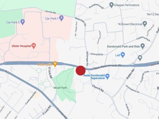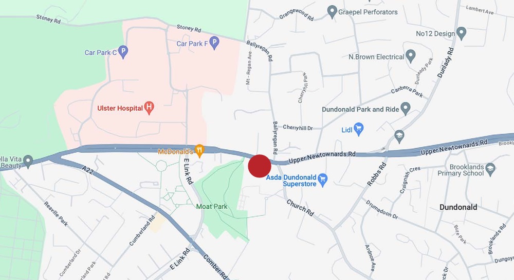 Prominent Location on the main Upper Newtownards Road in the heart of the densely populated Dundonald village, close to the junction with Church Road. The Ulster Hospital, an ASDA Supermarket and a McDonalds Drive Thru are all located nearby. The property is located approximately 6 miles east of Belfast City Centre and 4 miles from Newtownards Town Centre.